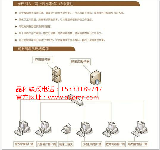 厂家供应网上阅卷系统,学校首次使用时将进行免费,免费上门安装调试。软件免费升级。 品科网上阅卷系统具备的优点: 1答题卡制作简单、印刷方便节约成本。提供MS-Word答题卡制作插件,仅需输入相关参数系统据用户需求自动生成A4、A3、B5、B4等各种标准答题卡模板。60克以上纸张采用复印、速印均可正常使用。 2填涂问题试卷批量导出,针对培训。对于涂错、涂重考号,书写不规范的考生系统自动挑选答题卡,批量导出,针对性纠正考生作答问题,规范高考答题。 3A/B卡混读。A、B卷答题卡混乱放置,准确识别,减少分卡工作量。 4OMR校验功能。软件具有空白、临界、缺考、违纪等多种标识试卷确认及二次识别功能确保客观题识别精 确。 5B/S架构,系统布置简单,环境要求低。纯B/S架构,客户端无需安装任何插件,系统使用于有还原卡、无线网络的局域网,且可广域网阅卷。 6标志试卷、使讲解更具针对性。阅卷教师可提交优 秀试卷、典型错误、特别试卷等标志试卷,标志试卷可网络展示、可批量下载且多名阅卷教师的标志试卷可资源共享,方便课堂讲评。 7考生成绩提供网络查询。考生可网络查询个人总分、单科分及排名,各题得分、答题情况、标准答案、教师批注等信息。 8监控功能强大,提高阅卷质量。监控总体进度、各题阅卷进度,随时调整阅卷任务,确保阅卷速度。监控各题总平均分与教师个人阅卷平均分对比,及时调整阅卷标准。教师评阅试卷抽查,问题试卷可打回重阅、可直接判分,确保阅卷质量。 9报表齐全,一键导出。成绩表、试卷分析表、历次成绩对比表、教师教学质量评价表涵盖教育测量学所有指标,,只需配置相关参数所有报表即可一键导出。 http://www.akomr.com/7.html |