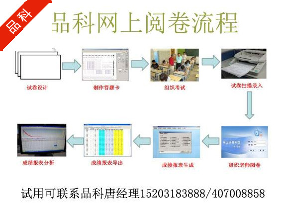 河北品科信息科技有限公司网上阅卷系统工作流程: 答卷扫描识别扫描完成后,评卷教师按照系统授权登录系统,并在电脑IE浏览器上评阅考生的主观题答卷; 成绩统计分析 主观题评卷完成,系统将按照用户设定的统计项目、科目及指标进行统计分析,并生成各类统计分析报告。 系统功能 确保阅卷质量(2)在流水线评卷状态下,免去了相互等待的时间。 (3)免去了大量的数据处理与统计分析工作(全部由系统自动完成)。 实际使用结果表明,网上阅卷的效率是人工阅卷的5倍以上。 提高教学水平(1)针对个人、班级、年级(学校)和科目、题目、小题(知识点)考试的详细分析。