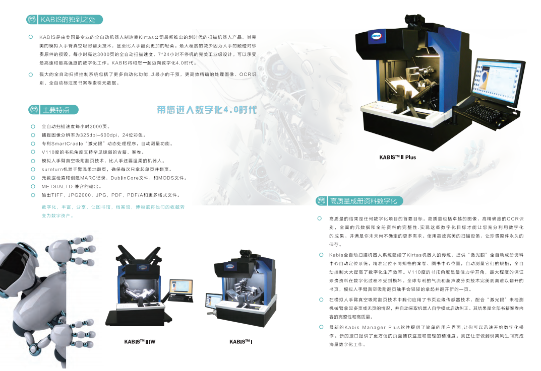 设备型号:全自动案卷书刊扫描机器人kirtas kabsⅡ型 技术参数:2300页/小时,真空吸附式自动翻页扫描机器人;扫描台110度V型22.1兆相机X1 设备型号:全自动案卷书刊扫描机器人kirtas kabsⅢ型 技术参数:3300页/小时,真空吸附式自动翻页扫描机器人;扫描台110度V型22.1兆相机X2