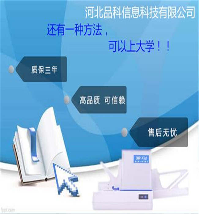 品科生产的阅卷机及其产品配套设施均由厂家技术送货上门 公司秉承“保证质量,保持一级信誉”的经营理念,坚持“客户”的原则为广大客户提供优质的服务。我公司技术人员可送货上门,给用户进行使用指导和技术培训。产品保修3年,保修内容包括机器损坏的任何配件,均可发回原厂进行维修翻新,使用时间可延续10年之久!我们另外会赠送给您3套软件(1,教学考试软件2,教师评估软件3机器调试软件)和3套橡胶皮带(机器别用零件)还有维修工具! 分类 按光标阅读 机读卡的类型分:有单面单读、单面双读、双面单读、双面双读 按光标阅读机识别的类型分:铅笔识别、全识别(非红非白涂点) 按光标阅读机录入最 大信息卡的路数分:32路、40路、43路、50路等 按光标阅读机和PC的连接方式分:ISA卡、 COM口、USB口、脱机
